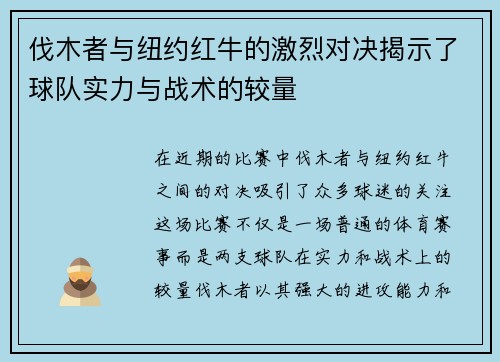 在近期的比赛中,伐木者与纽约红牛之间的对决吸引了众多球迷的关注。这场比赛不仅是一场普通的体育赛事,而是两支球队在实力和战术上的较量。伐木者以其强大的进攻能力和稳健的防守体系,给纽约红牛带来了极大的挑战。而红牛则凭借敏锐的战术部署和灵活的应变能力,展现出不俗的表现。本文将从四个方面详细分析这场激烈对决背后的深意,包括球队实力、战术布置、核心球员表现以及比赛结果对未来的影响,以揭示两队在赛场上所展现出的不同风格与竞争力。